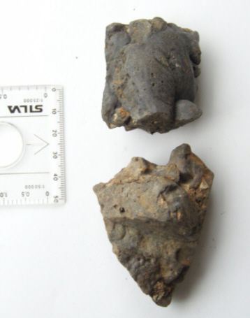 矢掛市 東三成地区 現地訪問 (08.5.21訪問) 東三成地区にある公園の裏山を「堂ケ丸」と言う。この山の南麓に金くそ散在地がある。山の中へ少し入るとたくさん落ちている。山すそにあたり、広い平地はない。 ![]() 金くそ その1 気泡多いスラグ状 軽い 磁石つかない。 ![]() 金くそ その2 表面滑らか 重い 気泡少ない 磁石つかない ![]() 金くそ その3 小石がかみこんでいる 重い 気泡少ない 磁石つかない (調べたこと) 1)「矢掛町史」には、たたらのことは記載がない。中世、猿掛山ふもとの横谷地区では刀鍛冶が盛んだったと記述あり。 2)矢掛文化センターで、堂ケ丸でのたたら製鉄について聞いた。このあたりは「河原谷廃寺あと」と呼ばれているところとのこと。律令時代。寺院建設に釘などの鉄製品が必要なので野だたらがあったのだろうとの話だが、推測の域を出ない。 3)このあたりには、「砂」「にご」のついた地名が多い。北の美星町には「水砂」地名がある。 この金くそは、古代の野だたらのもののように思えるが、確証なし。 (追加記事) 「かわらたに」は、瓦谷 ともいう。昔(奈良時代)の瓦が多数落ちているからとのこと。 −−−−−−−−−−−−−−−−−−−−−−−−−−−−−−−−−−−−−−−−−−−− 付録 今回の金くそ発見はドラマチックだった。遊歩道散歩のつもりで立ち寄った公園。ここでは、昔の「かわらけ」(瓦の破片)が落ちていると言うので、下を見ながら歩いていた。ところが、足にこつんとあたったものは、「金くそ」だった。遊歩道の真中に転がっていた。地元の方に、このあたりでたたらのうわさは聞かないか訪ね歩くと、金くそが落ちているところを教えてくれる方がいた。(この方から金くそと、「かわらけ」を見せてもらいました。)教えてもらった所は、谷川のそばで、山の斜面、・・・・・。備中鉄の道が、海のそばまで近づいてきたのかな、とわくわくしながら、いくつか拾って帰った。 (08.5.24 記)(08.10.3 追加) |