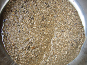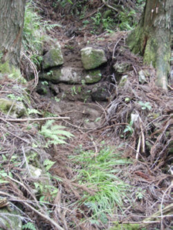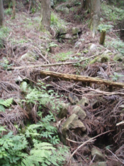 西粟倉村 大茅地区 現地訪問 (08.8.10 訪問) 西粟倉村を縦断する吉野川の上流には、かって明治期までたたら製鉄がおこなわれていた「永昌山鉄山」がある。 大海里川は、吉野川の支流で上流は大海里渓谷と呼ばれる清流である。 (砂鉄採取推定地) 大海里川の上流には、不自然な「なる地」がある。 ![]() 谷の上流方向を見る (水路状跡地) 大海里川中流域にに、石組で補強した水路状の跡地があった。 大海里川へ流れ込む谷川に沿って、1mほど高くなった所にほぼ15mにわたって水路状の跡地がある。上流側水路状溝と、下流側水路状溝は堰により仕切られている。 ![]() 写真左は 幅50cm、深さ50cm、長さ6mほどの水路状溝全景。上流端に、堰の形をした石組みがある。 写真右は 石組みの堰。土を除くと堰には、上部に凹部があった。 (聞き取り) 水路跡は、農業用水に関するものが多く、これもそうかもしれないと思い土地の古老(90歳とのこと。元気な方だった。)にお話を伺った。 1)大海里川中流域から、農業用水を取ってはいない。 2)大海里川で、鉄穴流しをしていたかどうかは、よくわからない。子供のころに鉄穴流しをしていたようにも聞いたが、そのころは興味が薄く定かではない。 3)大茅には、かって8軒の集落があり、その昔たたら製鉄に従事していた。子供のころ、そこへ野菜を運んでいった。その時は、もうたたらではなく、林業(炭焼き?)を生業としていた。今は、その集落はない。 4)この地区には、たたらに関係のある姓をもつ家が多い。兵庫県の千種から移り住んだ。 水路状溝は、「近世鉄穴流し遺構」かもしれないと、想像をたくましくして帰途についた。 −−−−−−−−−−−−−−−−−−−−−−−−−−−−−−−−− (資料調査) 大海里川で、鉄穴流しが行われていた記録を探したところ、明治8年の記録があった。 明治8年、永昌山鉄山の稼主であった木曾吉太郎が経営に困り鉄山を鳥取県因幡国邑美郡の河野庄蔵という人に売り渡しており、その中に次のような記事がみえる。 売渡証書之事 北条県管下 美作国吉野郡大茅村 字 下 東 四千八百坪 字シル谷 三千坪 字三曾木 弐千弐百坪 字 新 田 四千坪 字タイ海リ 四千二百坪 同国同郡中谷村 字大トウ 弐千五百坪 合計鉄砂場弐万零七百坪 工部卿伊藤博文殿仮坑区書六通 (大原町古町 田中家文書) ・・・・・・・・ −−−−−−−−−−−−−−−−−−−−−−−−−−−−−−−−−− (持ち帰り土砂) 水路状溝から土砂を持ち帰り、水洗後磁石で砂鉄の有無を調べた。・・・・・・全くなかったのでガッカリした。 ![]() 雪が降る前に、もう一度訪問したい。 (08.8.29) |