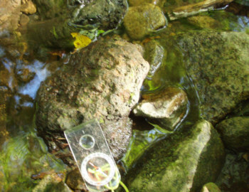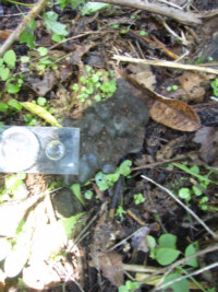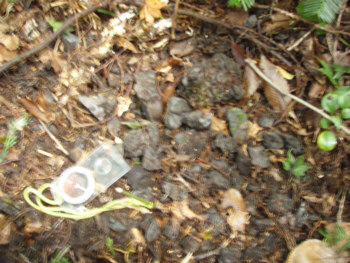 新見市神郷町 三室地区 現地訪問 (08.9.27) 三室山鉄山の稼業地を特定するために、三室地区を訪ねた。また、現地の方にお話を伺った。 1)かなくそ捨て場を見つけた。明確なかなくそ捨て場は、730m林道分岐(三国山登山口)のすぐ下流。 2)たたら操業が行われていたと思われる場所を2か所推定した。730m林道分岐広場と、もう少し下流の支流沿い平地。 −−−−−−−−−−−−−−−−−−−−−−−−−− (かなくそ捨て場の発見) 1)三室川本流沿いのかなくそ捨て場 三室川を川沿いに歩き、かなくそが川に見られなくなる場所を特定した。舗装路から三国山登山口へ入る分岐地点から、川沿いに川の中のかなくそを確認しながら上流へ歩いた。 ![]() 川の中のかなくそ 20cm大 小さいものもたくさん落ちている 川の中に、かなくそが数多く見つかる場所があった。その横の斜面を20cm掘り起こすと多量のかなくそが見つかった。 ![]() 斜面を掘り起こして見つけたかなくそ。撮影のために集めてある。 斜面の上は、土と杉小枝で埋まっているので掘り返すことはしなかった。ここは川に近すぎることからかなくそ捨て場で、たたら稼業はもっと山沿いで行われていたと推定。場所不明。 さらに川を遡行する。川は、標高730mの林道分岐点で2方向に分かれている。本流の左俣はかなくそがない。小さい流れの右俣はかなくそが落ちていた。ここらあたりは、広場のようになっている。 川分岐の20m下流が、かなくそ捨て場になっていた。 ![]() 左 かなくそ捨て場 奥に川が流れている。右が上流。 右 かなくそ捨て場のかなくそ 2)支流のかなくそ捨て場 730m分岐の200m程下流に北側から、三室川に流れ込む支流がある。ここに、かなくそが落ちていた。 支流の斜面にもかなくそ が落ちていた ![]() 左 支流の様子 中 支流の右岸の川沿いの広場 ここでかなくそを探したが見つからなかった。 右 支流右岸の斜面に落ちていたかなくそ 磁石弱く付く ![]() 左 支流の中に落ちていたかなくそ 右 支流の中にあったお椀のかけら 「東陽軒 平八製」とある。模様はプリントで、大正後半から昭和はじめのものらしい。大正期には、この地ではたたら製鉄はすでに終焉を迎えていたので、たたら関係者が使用したとは考えにくい。ちょっと、残念。 (たたら稼業推定位置) @川分岐のかなくそ捨て場の上流。(登山口表示のあるあたりの広場) A北側支流の右岸の広場 三室鉄山の稼業の中心は、730m分岐広場あたりと思われる。 (現地での聞き取り) 三室で 地元の方にお話を伺った。 1)たたら製鉄を行っていたと思われるのは、三室川上流、宮ノ谷川上流、青笹川の滝の下の公園の所(カメガハラ)。 三室川上流と、青笹川は確実。宮ノ谷川はよくわからない。 2)宮ノ谷川では、鉄穴流しがおこなわれていた。水路跡の石垣が残っている。 3)家に、昔の「村と鉄山師とのたたらの取り決め」古文書がある。