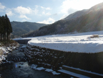 上斎原村 遠藤川流域 現地訪問(07.12.14訪問) −−−−−−−−−−−−−−−−−− 上斎原村の かってたたら製鉄が行われていた遠藤川流域を訪ねた。 遠藤川上流域(三十人ヶ仙、天狗岩の西側斜面)は、地形図を見ると尾根、谷が明確でなく 複雑な地形となっている。 遠藤川を利用したかんな流しが行われたことを想像させる。 1)遠藤川支流上流域を、林道を歩いて訪ねた。あいにく雪が降っていたので視界が悪いが 山を崩したような丸い形状の尾根が目立つ大きな谷があった。この山域は、なだらかな広い谷が多い ![]() 丸い尾根端が特徴的な広い谷 2)遠藤川支流のひとつを上流へ歩いたところにある、広い谷。 山の斜面は、なだらかで 「なる地形」を示す。 (「なる地形」は、私の呼び名で 谷川の岸がなだらかな広い谷を言う。) ![]() 「なる地形」 (地図の「なる地形」の位置) 3)遠藤川本流の上流域、遠藤集落を通る支流域に大きな田が広がる。 ![]() 遠藤川左岸に広がる大きな田 4)遠藤集落で 話を聞くことが出来た。 @遠藤集落は、かってたたら製鉄を生業とした集落である。 現在 33戸あるが 家の苗字は多様である。かって、出雲、千草などからたたらの仕事を求めて来た歴史があるからとのこと。 Aお聞きした方の家には「金之大神」の掛け軸があるとのこと。 B遠藤集落には、「金屋子神社」がある。今回、新しく立て直したとのこと。 ![]() 金屋子神社 ![]() 金くそ Cかんな流しは、「はか谷」で行っていたと聞いている。(支流のどちらかの谷らしい) 今は、訪ねても荒れてわからない。 −−−−−−−−−−−−−−−−−−−−−−−−−−−−−− 以上をお聞きした。 苗字は、たたらを思わせる苗字が多い。 また、こういった集落は苗字が1つにまとまる傾向があるが、ここは人の出入りが 多かったのであろう。ある意味で、近代的(工業的)。 「はか」という呼び名は、加茂町青柳地区で「墓鳴(はかなる)」という名称を見た。 「はか」という名称はたたら関連らしい。(は は古語で 土のことと聞いたことがある。) 興味はつきない。 (07.12.15) |