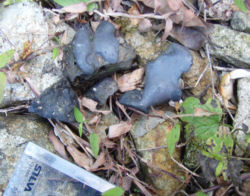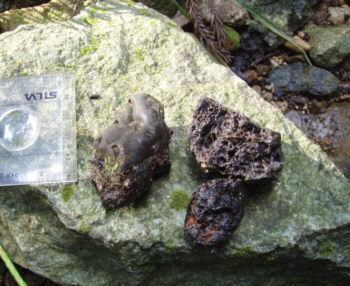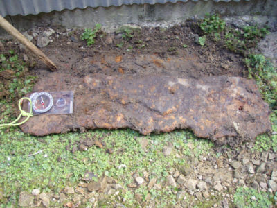 新見市神郷町 油野地区 青柳川 現地訪問 (08.10.13訪問) 青柳川中流の「亀ヶ原」でかって、たたら製鉄がおこなわれていたとのことで訪問した。 1)青柳川中流、上流にかなくそが落ちていた。、かなくそ捨て場があった。 2)青柳川上流の民家近くに、3か所たたら製鉄がおこなわれていた場所があった。(地元の方の情報) その一つは、かってはたたら炉の底部(固く敷き詰めた部分)があったが今は埋めてしまったとのこと。 3)青柳川の最上流部には、大量のかなくそが捨ててある場所があった。さらにここは、鉄穴流しの土砂採取地のような地形になっている。青柳川でも鉄穴流しが行われていたと思われる 4)亀ヶ原のたたら稼業地は、今は公園になっている。かなくそを見つけた。 参考 阿哲郡における近世、明治、大正期のたたら操業の記述(阿哲郡誌 抜書き) −−−−−−−−−−−−−−−−−−−−−−−−−−−− (青柳川に落ちているかなくそ) かなくそ その1 ![]() かなくそ その2 この場所の川左岸平地は、かなくそ捨て場になっており、土の下5cmほど掘るとかなくそがたくさん見つかった。 (上流民家近くのたたら稼業地) ![]() たたら稼業地 たたら製鉄炉があったが埋めてしまったとのこと。斜面の石垣には石に交じって、かなくそが使われていた。 地元の方にお話を伺った。 1)ここには、たたら製鉄炉の底部が残っていた。馬が、落ちたので埋めてしまったとのこと。リンゴ畑のあたりには、大量のかなくそが山のように積まれていた。 2)この近くには、3か所たたら稼業地があった。一つは下のほう。一つはちょっと上のほう。川には、かなくそがごろごろあり、今でも20cmくらいのかなくそは簡単に見つかる。 3)かなくそには、たたらのものと鍛冶屋のものとがある。鉄が、まだ残っているものと、そうでないものの差だ、とのこと。(見分け方を教えてもらおうとしたが、要領を得なかった。) 4)ずくがある。 ずく 長さ50cm 高温でも溶けないので、炭焼き釜を作る際に基礎にした、昔は、これを買うこともあったとのこと。阿哲郡誌に「大正期になると、銑鉄は他所から購入した」とあるので、そのことに対応するのであろうか。 (青柳川最上流のたたら製鉄稼業地) 最上流に、かなくそが道路に敷き詰められているところがあるとのことで行ってみた。 ![]() かなくそが、多量に落ちていた道路付近 鉄穴流しによる土砂採取あとのような地形であった。 ![]() 道路のかなくそ (亀ヶ原たたら稼業地) 帰りに亀ヶ原に立ち寄った。公園になっていたが、山側の遊歩道に入るとかなくそが落ちていた。 ![]() かなくそ −−−−−−−−−−−−−−−−−−−−−−−−−−−−−−−−−−− 青柳川では、中流から上流にかけて 少なくとも6か所のたたら製鉄稼業地があった。確実なのは、民家前の場所と、亀ヶ原。あとはかなくそ散在地があったのが2か所。2か所は情報のみ。言い伝えで残っているので、比較的最近(江戸後期以降)のことであろう。 同時期ではないのだろうが、、あちこちでやっている感覚はこれまで私が持っていた感覚と異なる。鉄山師がいて、たたら集落を作り大がかりに製鉄を始めるといった印象ではなく、ちょっと小屋でも建ててたたらを吹いてみるかといった感じだ。 (08.10.16) |