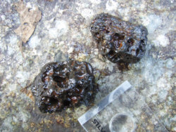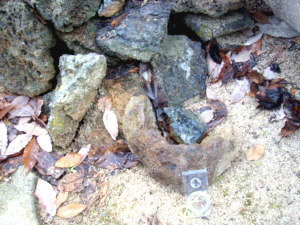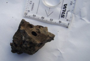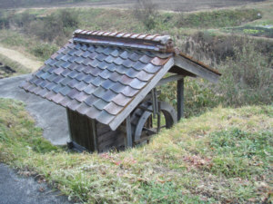 広島県庄原市西城町 小鳥原地区 現地訪問 (08.12.10訪問) 「小鳥原(ひととばら)砂鉄精錬場跡」(大谷山たたら)を訪ねた。 (小鳥原砂鉄精錬場跡) 以下庄原市パンフより。 「わが国独自の製鉄技法である『たたら吹き製鉄』の代表的な遺跡です。昭和7年の調査で、『高殿』、『元小屋』、『銑破砕工場』、『砂鉄再洗場』、『落池』などの施設がまとまって確認されており、約500m離れて『大鍛冶場』跡もあります。大正7年の改築記録を有し、同10年まで操業が続けられて県内最後の製鉄場となりました。」 ![]() 写真左 小鳥原砂鉄精錬場跡 写真右 谷の奥で拾ったかなくそ 跡地周辺には、かなくそはなかった。道路を100mほど谷奥へ入ったところの道路上ででかなくそを見つけた。谷川へ入って、かなくそを探したが谷川にはなかった。 (聞き取り) 精錬場を通りかかった車の方に、たたら製鉄、鉄穴流しのことをお聞きした。 1)かなくそは、ここのほかでも見つけることができる。 2)鉄穴流しのことは、きかない。 3)詳しい人が、坂根集落にいるので訪ねてみるとよい。 ということで、坂根集落の方を訪ねた。古老の方に、いろいろお聞きした。 1)精錬場跡は永代たたらだが、そのほかにも野だたらがおこなわれていた。この谷の奥。江戸時代。 今は、行ってもわからないだろうなあ。 2)我が家の前に、鍛冶屋があった。大きな「鉄さい」を拾っている。もし、欲しければどれでも持って帰っていいよ。(と、何度も勧められたが、5kg以上の塊だったので丁重にお断りした。) 3)鉄穴流しは、ここでは行われていなかった。 4)このあたりのたたらを経営していた鉄山師が居て、近在の人たちは雇われ仕事をしていた。 ![]() 写真左 鍛冶屋跡から運んだ大きな鉄さい。左のものは、鉄分が多く、重かった。 写真右 同じく鉄さい 手前のバナナ状のものは、重い。あとのものは、軽い。 (坂根集落の奥の谷) 古老に聞いた「たたら跡」を探して1kmほど谷の奥へ入った。谷川でかなくそを探すと、数は少ないが落ちていた。 ![]() 写真左 坂根集落の奥の川、天樋川。この川は、高梁川水系ではなく、日本海へ注ぐ。 写真右 川で拾ったかなくそ 乾いていないので、光っている ![]() 坂根集落のある天樋川の谷 −−−−−−−−−−−−−−−−−−−−−−−−−−−−−−− (付録) ![]() 小鳥原のソウズ 「昭和23年製。水流を駆動力として現役で稼働する、西城地域唯一の精米製粉用水車(『ソウズ』)です。木造で、何回かの修理を経ながら今日まで稼働を続けてきました。天然エネルギーを巧みに用いた先人の知恵を今に伝える貴重な民俗資料といえます。」 (08.12.13) |