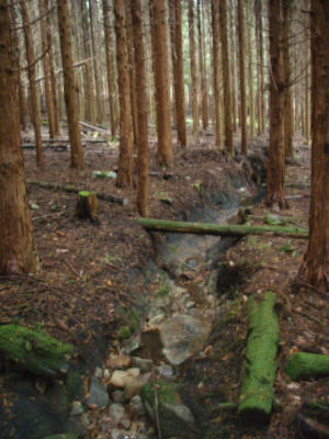 新見市神郷町 釜村地区 現地訪問(07.12.17訪問) −−−−−−−−−−−−−−−−−− ガイドブック「新ルート 岡山の山 百選」の天銀山の項に ふもとの池がかんな流しの 堀跡に出来たものだとの記載があり訪問した。 1)池 砂鉄採集のために掘った穴か、かんな流しのために水をためた池か不明。 立派な土手があり、穴という感じではない。 ![]() 池 2)溝 上の池に入る溝と、出てゆく溝があった。下の写真は、池に入る溝。 かんな流しが行われていたのは、この地域では明治初頭までで100年も前のこと。 その後、牛の放牧場になり、さらにスキー場になった。かんな流しの水路が残っているとは 考えにくい。それらしく見えるが。 ![]() 溝 3)「なる地形」と、その下流にある広い田 大忠(おおただ)地区は、西を流れる三坂川の支流上流域にあたる。池周辺には「なる地形」が 広がり、その下手に広い田が広がるが、かんな流しの現場としては近接しすぎている。 ![]() 「なる地形」 ![]() 大忠地区の田 5)竹の谷タタラ跡 訪問 「岡山県万能地図」(山陽新聞社)に掲載の「竹の谷タタラ跡」 を探して三ヶ市より北へ入ったが、見つけることが出来なかった。 地区の方に、お話を伺った。(昔というのはいつごろのことか定かでない。) @タタラ跡は、あったが道路造成などで一部壊されたりしている。 A竹の谷地区は、「竹の谷系統牛」で有名なところ。この地区でたたら製鉄、かんな流しが広く行われていたとは聞いていない。 谷には、昔は大きな屋敷もあり、お宮もあったが今はない。 B竹の谷の 谷入り口山の上に昔、お城があった。「城前(じょうのまえ)」、「屋敷」という名前が残っている。 C釜村とは、線路(伯備線)から東の広い範囲を言う。一帯では、牛の放牧が盛んであった。 大忠地区では、もっぱら牛の放牧を行っていた。大忠地区でのかんな流しのことは知らない。 以上であった。たたら製鉄は、この地区が牛の放牧で栄えた前のことで、この地区でも語り継がれていないように感じた。 帰宅後、「竹の谷系統牛」のことを調べると、畜産史HPに詳しかった。全国的にも有名らしい。 また、千屋牛で有名な太田辰五郎は、代々鉄山師であり、たたら製鉄で財をなしその財でもって牛の品種改良に乗り出し 成功を収めたとのことであった。 釜村は、新見藩の藩営鉄山「久坂山鑪」があったところで、このあたりで、かんな流し、たたら製鉄が行われたのは確か。 しかし、その痕跡は地名と地形のほかにはほとんど残っていない。 (07,12,19) |
