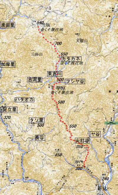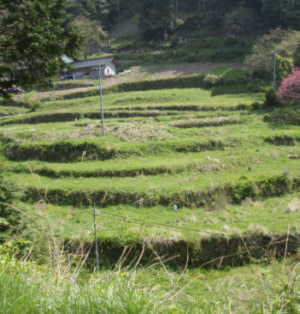 −−−−−−−−−−−−−−−−−−−−−−−−−−−−−− (新見庄畠取帳に見る鎌倉時代の様子) 「備中国新見御庄 文永八年辛未領家御方正検畠取帳」(鎌倉末期から戦国時代の東寺百合文書) 文永八年(1271年)、新見庄の領地を「下地中分」するために田畑の検地を行った。現在の谷内から、吉川にいたる道筋沿いの地名、田畑の様子が分る。新見庄ではそれまで、田畑が盛んに開墾されてきた。 ![]() 棚田 (数年前から作られていない。) 芋原は、吉河里の一部であったようだ。今の所に集落があったかどうかははっきりしない。 芋原を通り、上市へ抜ける山道は 中世より、京都との人の往来、年貢などの物資を運んだ道であった。芋原集落がその頃にあったかどうかは不明。西吉川、東吉川、フシヤ谷は地名としてあるが芋原集落を示す地名はない。 芋原地名は、時代が下って「備中国絵図」(元禄元年頃(1688年頃))に、見ることが出来る。この頃になると、吉川村、芋原村・・となっているので、独立した集落とみなされるようになったのだろう。往来筋の宿場として発展したのか、たたら製鉄の集落として発展したのかは不明。 新見庄は平安末期に成立して以来田畑が開墾され米その他の作物が作られると同時に、鉄、漆、蝋、紙などの特産物が作られた。いわゆる「伯耆往来」はこれらを、上市、さらには京都へ運ぶ道であった。 ![]() 「備中国新見御庄 文永八年辛未領家御方正検畠取帳」に見る地名 位置は、「新見市史(新見市史編纂委員会編):付図1 文永八年二月備中国 新見庄名分布 その1」に従った。 (数字は、各地の標高を示している。) −−−−−−−−−−−−−−−−−−−−−−−−−−−−−− (08.5.20)(08.6.20) |