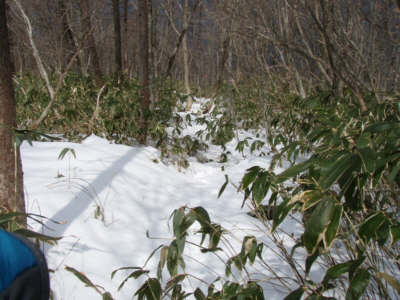 残雪あり。林道直進し終点から西向きに尾根を登る
