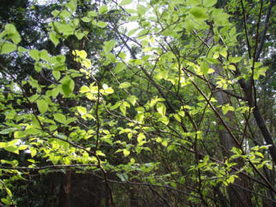 峠まで来て一休み。木漏れ日に輝く新緑。