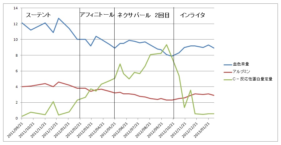 2012年10月23日より、インライタ(5mg錠×2錠)服薬を始めた。インライタは、効果があった。
