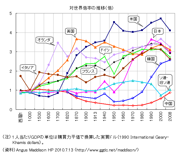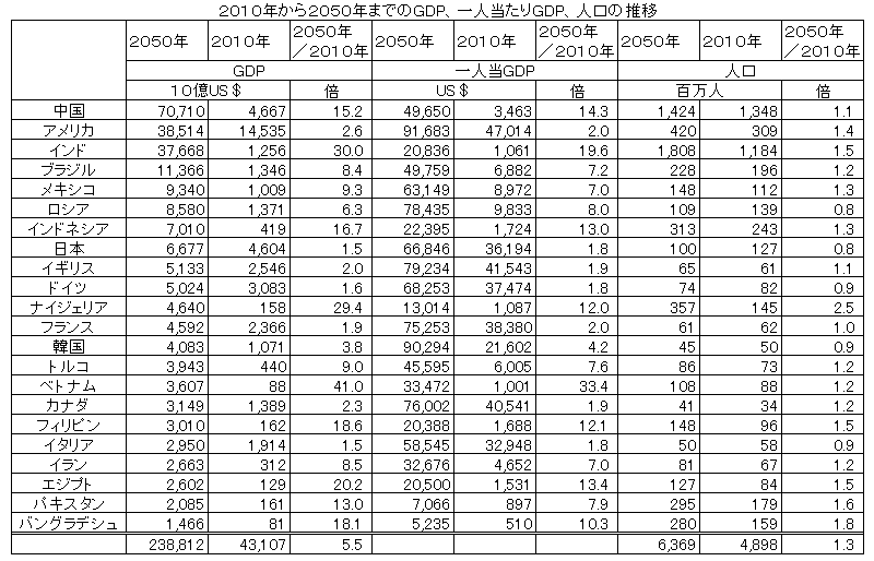 ![]() ("BRICS AND BEYOND" - Goldman Sachs study of BRIC and N11 nations, November 23, 2007.を調整) 2010年、世界でのGDP大国は、 アメリカ、中国、日本、ドイツ、イギリス、フランス、イタリア、ロシア、ブラジル、インド 2050年には、それが 中国、アメリカ、インド、ブラジル、メキシコ、ロシア、インドネシア、日本、イギリス、ドイツ になると予想している。 いわゆるBRICSの台頭である。2010年、アメリカのGDP15兆ドルに対し、中国、日本はそれぞれ5兆ドルで、アメリカの3分の1の規模であった。ところが、2050年の予想では、中国は70兆ドル、アメリカ38兆ドルに対し、日本は7兆ドルと予想されており、アメリカの5分の1、中国の10分の1の経済規模しか持たない国になってしまう。このとき、インドは、38兆ドル、ブラジルは11兆ドル、メキシコ、ロシアが9兆ドル、インドネシアが日本と同じ7兆ドル規模の国となる。(数字は、表の数字を使っており、2010年実績とは異なる。以下も同じ) かって、高い文明を誇った中国、インド、そして南米の国がまた大国として立ち現れることになる。日本は、また極東の辺境の島国として独自の道を歩むことになるのだろうか (異なる予測の紹介:Wikipedia BRICS から)) 日本経済センターは、2008年1月に2050年の購買力平価に基づくGDP予想順位を、1位アメリカ、2位中国、3位インドとしている。 プライスウォーターハウスクーパースは、2008年3月発表で、1位中国、2位アメリカ、3位インド、4位ブラジル、5位日本、6位ドイツ、イギリス、ロシア、メキシコ、インドネシア とした。 ゴールドマンサックスの2050年予測も、その数字自体はともかく大きな流れは当たっているであろう。 (世界経済規模について) 世界経済規模が、2010年の43兆ドルから、2050年240兆ドルと40年間で5.5倍にもなると予想している。これは表にある人口の多い国々22カ国の予想である。この22カ国の2010年の人口は49億人で、世界全体69億人の70%をカバーしている。2050年の世界経済規模は、ここにない国々の人口分だけ単純に増やしたとすると、240兆ドル÷0.7=340兆ドルと予想される。 2050年には、世界人口は90億人になると予想されている。もし、2050年に世界の全人口が2010年の日本、イギリス、ドイツの一人当たりGDPの大きさ4万ドルの生活レベルを得るとすると、90億人×4万ドル=360兆ドルとなる。この数字は、上の2050年の世界経済規模340兆ドルにほぼ見合う数字だ。 (持続可能な地球) 2050年には、世界の人々が今の私たち日本人と同じレベルの生活を送っていることになる。世界の人々は、貧しさから脱却しさらに高いレベルの生活を目指しているであろう。・・・本当に、こうなるだろうか。地球は、こんな大きな規模の生産活動を支えていけるだろうか。私は、非常に懐疑的である。 90億人の人口予想はほぼ当たるであろう。しかし、経済規模がこんなに大きくなって持続可能とは、今の私には思えない。一人当たり4万ドルの生活レベルを見直す必要がある。1920年代のアメリカは飽食の国で、今もそうである。アメリカ人の生活に憧れ、日本人は頑張ってきた。中国やその他のこれから発展しようとしている国の人に今の生活レベルで我慢しろとはいえないだろう。一人ひとりが自らの生活を良くしていきたいとがむしゃらに頑張って、そしてそのうち気がついてみると地球の資源は枯渇し、土壌は回復不能になり、そして止まることのない人口減少が始まるのだろうか。 to top posted by tamatama at 20:54| 世界/経済・・ 2011年02月23日 「銃・病原菌・鉄」を読む 著者 ジャレッド・ダイアモンド (カリフォルニア大学ロサンゼルス校医学部教授) 訳者 倉橋 彰(数理言語学博士) 出版 草思社 上下2巻、副題 1万3000年にわたる人類史の謎 アメリカ資本主義発展に果たす奴隷貿易の役割を調べていたとき、西インド諸島では殺戮と疫病でその原住民のほとんどが死に絶えたと、上述の本に掲載されていることを知った。図書館で借りて読んだ。内容すべてが興味深く一気に読んだ。 −−−−−−−−−−−−−−−−−−−−−−−−−−−−−−− (内容) 1)なぜ、オーストラリア大陸の先住民アボリジニが、ヨーロッパから来た白人に征服され、その逆ではなかったのか。 2)なぜ、アメリカ大陸の先住民が、ヨーロッパから来た白人に征服され、その逆ではなかったのか。 3)人類は、アフリカ大陸で紀元前700万年に発生した。その後、狩猟生活を続けながら紀元前100万年にユーラシア大陸のアジア地域に、紀元前50万年にヨーロッパ地域に、そして紀元前4万年にオーストラリア大陸へ、紀元前1万年にはアメリカ大陸へ移住した。オーストラリア大陸、アメリカ大陸では、家畜に出来る大型動物を食料として取り尽くし、絶滅させてしまった。ユーラシア大陸では、豊富に動物がいたことや国土が広かったために家畜に出来る大型動物が残った。 4)ユーラシア大陸では、そのほかのオーストラリア、アメリカ、アフリカ大陸よりも早く狩猟生活から栽培農耕生活に入った。それは