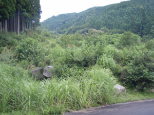 西粟倉村 大茅地区 現地訪問 (08.8.10 訪問) 西粟倉村を縦断する吉野川の上流には、かって明治期までたたら製鉄がおこなわれていた「永昌山鉄山」がある。 大海里川は、吉野川の支流で上流は大海里渓谷と呼ばれる清流である。 (砂鉄採取推定地) 大海里川の上流には、不自然な「なる地」がある。 ![]() 谷の上流方向を見る (水路状跡地) 大海里川中流域にに、石組で補強した水路状の跡地があった。 大海里川へ流れ込む谷川に沿って、1mほど高くなった所にほぼ15mにわたって水路状の跡地がある。上流側水路状溝と、下流側水路状溝は堰により仕切られている。 ![]() 写真左は 幅50cm、深さ50cm、長さ6mほどの水路状溝全景。上流端に、堰の形をした石組みがある。 写真右は 石組みの堰。土を除くと堰には、上部に凹部があった。 (聞き取り) 水路跡は、農業用水に関するものが多く、これもそうかもしれないと思い土地の古老(90歳とのこと。元気な方だった。)にお話を伺った。 1)大海里川中流域から、農業用水を取ってはいない。 2)大海里川で、鉄穴流しをしていたかどうかは、よくわからない。子供のころに鉄穴流しをしていたようにも聞いたが、そのころは興味が薄く定かではない。 3)大茅には、かって8軒の集落があり、その昔たたら製鉄に従事していた。子供のころ、そこへ野菜を運んでいった。その時は、もうたたらではなく、林業(炭焼き?)を生業としていた。今は、その集落はない。 4)この地区には、たたらに関係のある姓をもつ家が多い。兵庫県の千種から移り住んだ。 水路状溝は、「近世鉄穴流し遺構」かもしれないと、想像をたくましくして帰途についた。 −−−−−−−−−−−−−−−−−−−−−−−−−−−−−−−−− (資料調査) 大海里川で、鉄穴流しが行われていた記録を探したところ、明治8年の記録があった。 明治8年、永昌山鉄山の稼主であった木曾吉太郎が経営に困り鉄山を鳥取県因幡国邑美郡の河野庄蔵という人に売り渡しており、その中に次のような記事がみえる。 売渡証書之事 北条県管下 美作国吉野郡大茅村 字 下 東 四千八百坪 字シル谷 三千坪 字三曾木 弐千弐百坪 字 新 田 四千坪 字タイ海リ 四千二百坪 同国同郡中谷村 字大トウ 弐千五百坪 合計鉄砂場弐万零七百坪 工部卿伊藤博文殿仮坑区書六通 (大原町古町 田中家文書) ・・・・・・・・ −−−−−−−−−−−−−−−−−−−−−−−−−−−−−−−−−− (持ち帰り土砂) 水路状溝から土砂を持ち帰り、水洗後磁石で砂鉄の有無を調べた。・・・・・・全くなかったのでガッカリした。 ![]() 雪が降る前に、もう一度訪問したい。 (08.8.29) |