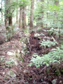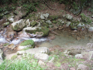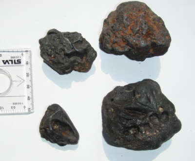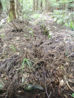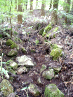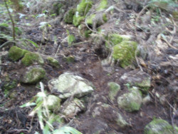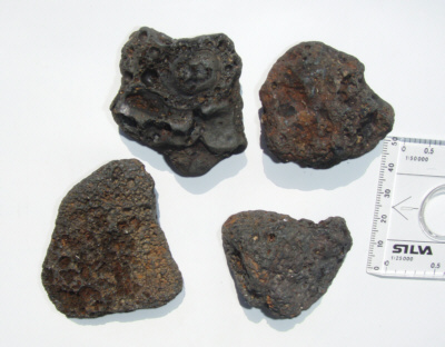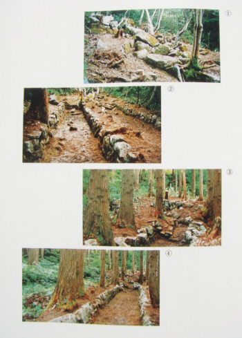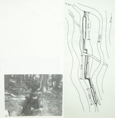 兵庫県宍粟市 千種地区 現地訪問 (08.9.20 訪問) 千種地区は、かってたたら製鉄が盛んだったところで、たたら製鉄集落の遺構が残る「天児屋(てんごや)鉄山」で知られている。天児屋鉄山は千種川上流にあり、その支流である河内川上流には三室鉄山があった。 1)河内川で、かなくそを採取した。河内川上流にたたら製鉄稼業場があったことを示す。 2)採取地点近くで、水路跡を発見した。鉄穴流し遺構と思われる。 (かなくそ採取) 1)河内川下流に大きな滝(燗鍋ノ滝:かなべのたき)がある。その滝下でかなくそを採取した。 ![]() 滝下で採取したかなくそ 磁石つかない 2)さらに河内川上流の川の中から、かなくそ採取した。(三室山登山口の看板のある三叉路の200m下流。) ![]() 川で採取したかなくそ 右上 磁石つく。 そのほか、磁石つかない。 3)千種川上流でのかなくそ採取 天児屋鉄山の山内遺構からさらに上流でも、かなくそを拾うことができた。 (たたらの里学習館の1km上流。水がきれい。) ![]() (水路跡の発見) かなくそ採取2) の場所の谷川に沿って、幅10〜15mの平地がある。そこに、水路跡があった。 西粟倉村で見た水路と同様で 側面は石積みで補強され長さ10〜15m、幅60〜60cm、深さ30〜50cmで、直列に3本ありそれぞれの下流端に、崩れているが石積みの堰があったように見える。 一番上流の水路と崩れた堰 その1 30分かけて、土を除いた。 ![]() 一番上流の水路と崩れた堰 その2 (その1と同じところを角度変えて撮ったもの) ![]() 左 2番目の水路 側壁の石積みがよく残っている 右 3番目の水路 杉小枝で埋まっている (聞き取り) 河内川下流の集落で、古老に話を聞いた。 1)たたら製鉄は、河内川上流域で2か所で行われていた。一つは、三室山登山口看板を左へ鳥取方面へ登ったところ。もう一つは、河内川上流の登山道の右岸側尾根ひとつ越えた谷奥。口で言っただけでは、わからんだろうなあ。モミすりの最中でなければ連れて行ってあげるんだがな。谷奥はまだ、手つかずだから、かなくそが山になっているだろう。 2)かんな流しも行われていた。井手跡も2か所ある。やまの奥だから、わからんだろうな。 (鉄砂仕上げ場遺構の例) このあと、天児屋たたら山内遺跡のある、「たたらの里学習館」を訪ねた。 本2冊購入。 「たたらと村 −千草鉄とその周辺− 」 鳥羽弘毅 著 平成9年 ・・・@ 「たたらと村と百姓たち −千種鉄関連資料集−」 井口二四雄 鳥羽弘毅 著 昭和58年 ・・・・A この本に、千種地区内の鉄穴流しの遺構の写真があった。 西粟倉村の大海里川沿いの水路跡、また今回の河内川水路跡はこの写真とよく似ている。 (大茅と千種は、同じ鉄山師が経営に携わったり、原料のやり取りなど関係が深い。技術も、同じように水平展開されていたろう。) ![]() 天児屋笹ケ谷鉄砂仕上げ場 @のP93 ![]() 天児屋鉄砂仕上げ場跡 Aの口絵 −−−−−−−−−−−−−−−−−−−−−−−−−− 西粟倉村の水路跡、今回見た水路跡どちらも、土と杉小枝に埋まっており石積みも崩れかけている。 きちんと土を除き、寸法など測りたいが 一人では大変。興味ある方がいれば、案内します。スコップ、軍手持参のこと! (08.9.22) |