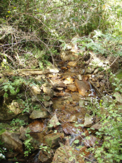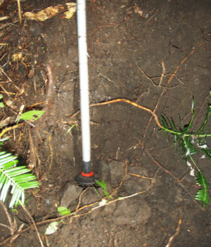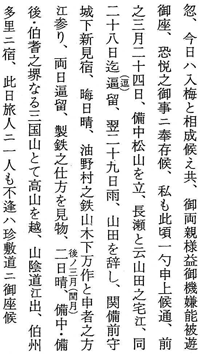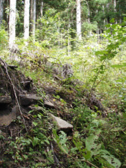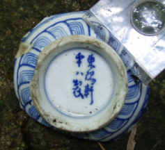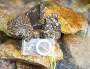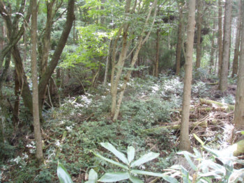 新見市神郷町 三室地区 現地訪問 (08.9.27) 三室山鉄山の稼業地を特定するために、三室地区を訪ねた。また、現地の方にお話を伺った。 1)かなくそ捨て場を見つけた。明確なかなくそ捨て場は、730m林道分岐(三国山登山口)のすぐ下流。 2)たたら操業が行われていたと思われる場所を2か所推定した。730m林道分岐広場と、もう少し下流の支流沿い平地。 −−−−−−−−−−−−−−−−−−−−−−−−−− (かなくそ捨て場の発見) 1)三室川本流沿いのかなくそ捨て場 三室川を川沿いに歩き、かなくそが川に見られなくなる場所を特定した。舗装路から三国山登山口へ入る分岐地点から、川沿いに川の中のかなくそを確認しながら上流へ歩いた。 ![]() 川の中のかなくそ 20cm大 小さいものもたくさん落ちている 川の中に、かなくそが数多く見つかる場所があった。その横の斜面を20cm掘り起こすと多量のかなくそが見つかった。 ![]() 斜面を掘り起こして見つけたかなくそ。撮影のために集めてある。 斜面の上は、土と杉小枝で埋まっているので掘り返すことはしなかった。ここは川に近すぎることからかなくそ捨て場で、たたら稼業はもっと山沿いで行われていたと推定。場所不明。 さらに川を遡行する。川は、標高730mの林道分岐点で2方向に分かれている。本流の左俣はかなくそがない。小さい流れの右俣はかなくそが落ちていた。ここらあたりは、広場のようになっている。 川分岐の20m下流が、かなくそ捨て場になっていた。 ![]() 左 かなくそ捨て場 奥に川が流れている。右が上流。 右 かなくそ捨て場のかなくそ 2)支流のかなくそ捨て場 730m分岐の200m程下流に北側から、三室川に流れ込む支流がある。ここに、かなくそが落ちていた。 支流の斜面にもかなくそ が落ちていた ![]() 左 支流の様子 中 支流の右岸の川沿いの広場 ここでかなくそを探したが見つからなかった。 右 支流右岸の斜面に落ちていたかなくそ 磁石弱く付く ![]() 左 支流の中に落ちていたかなくそ 右 支流の中にあったお椀のかけら 「東陽軒 平八製」とある。模様はプリントで、大正後半から昭和はじめのものらしい。大正期には、この地ではたたら製鉄はすでに終焉を迎えていたので、たたら関係者が使用したとは考えにくい。ちょっと、残念。 (たたら稼業推定位置) @川分岐のかなくそ捨て場の上流。(登山口表示のあるあたりの広場) A北側支流の右岸の広場 三室鉄山の稼業の中心は、730m分岐広場あたりと思われる。 (現地での聞き取り) 三室で 地元の方にお話を伺った。 1)たたら製鉄を行っていたと思われるのは、三室川上流、宮ノ谷川上流、青笹川の滝の下の公園の所(カメガハラ)。 三室川上流と、青笹川は確実。宮ノ谷川はよくわからない。 2)宮ノ谷川では、鉄穴流しがおこなわれていた。水路跡の石垣が残っている。 3)家に、昔の「村と鉄山師とのたたらの取り決め」古文書がある。