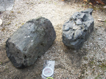 広島県庄原市西城町 小鳥原地区 現地訪問 (08.12.10訪問) 「小鳥原(ひととばら)砂鉄精錬場跡」(大谷山たたら)を訪ねた。 (小鳥原砂鉄精錬場跡) 以下庄原市パンフより。 「わが国独自の製鉄技法である『たたら吹き製鉄』の代表的な遺跡です。昭和7年の調査で、『高殿』、『元小屋』、『銑破砕工場』、『砂鉄再洗場』、『落池』などの施設がまとまって確認されており、約500m離れて『大鍛冶場』跡もあります。大正7年の改築記録を有し、同10年まで操業が続けられて県内最後の製鉄場となりました。」 ![]() 写真左 小鳥原砂鉄精錬場跡 写真右 谷の奥で拾ったかなくそ 跡地周辺には、かなくそはなかった。道路を100mほど谷奥へ入ったところの道路上ででかなくそを見つけた。谷川へ入って、かなくそを探したが谷川にはなかった。 (聞き取り) 精錬場を通りかかった車の方に、たたら製鉄、鉄穴流しのことをお聞きした。 1)かなくそは、ここのほかでも見つけることができる。 2)鉄穴流しのことは、きかない。 3)詳しい人が、坂根集落にいるので訪ねてみるとよい。 ということで、坂根集落の方を訪ねた。古老の方に、いろいろお聞きした。 1)精錬場跡は永代たたらだが、そのほかにも野だたらがおこなわれていた。この谷の奥。江戸時代。 今は、行ってもわからないだろうなあ。 2)我が家の前に、鍛冶屋があった。大きな「鉄さい」を拾っている。もし、欲しければどれでも持って帰っていいよ。(と、何度も勧められたが、5kg以上の塊だったので丁重にお断りした。) 3)鉄穴流しは、ここでは行われていなかった。 4)このあたりのたたらを経営していた鉄山師が居て、近在の人たちは雇われ仕事をしていた。 ![]() 写真左 鍛冶屋跡から運んだ大きな鉄さい。左のものは、鉄分が多く、重かった。 写真右 同じく鉄さい 手前のバナナ状のものは、重い。あとのものは、軽い。 (坂根集落の奥の谷) 古老に聞いた「たたら跡」を探して1kmほど谷の奥へ入った。谷川でかなくそを探すと、数は少ないが落ちていた。 ![]() 写真左 坂根集落の奥の川、天樋川。この川は、高梁川水系ではなく、日本海へ注ぐ。 写真右 川で拾ったかなくそ 乾いていないので、光っている ![]() 坂根集落のある天樋川の谷 −−−−−−−−−−−−−−−−−−−−−−−−−−−−−−− (付録) ![]() 小鳥原のソウズ 「昭和23年製。水流を駆動力として現役で稼働する、西城地域唯一の精米製粉用水車(『ソウズ』)です。木造で、何回かの修理を経ながら今日まで稼働を続けてきました。天然エネルギーを巧みに用いた先人の知恵を今に伝える貴重な民俗資料といえます。」 (08.12.13) |