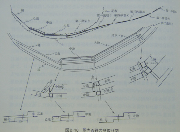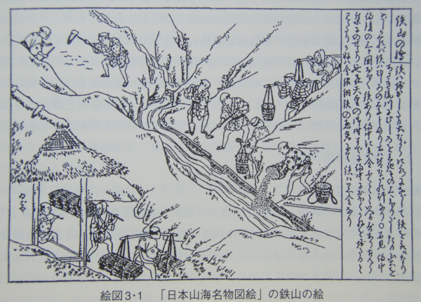 鉄穴流しによる砂鉄採集方法 以前から、江戸期、鉄穴流しの砂鉄採集がどうおこなわれていたのか気になっている。島根の羽内谷のような精緻な仕掛けでおこなわれていたのか、それとも「日本山海名物図会」に示すように川にむしろを敷いて採集したのか。羽内谷の仕掛けは精緻すぎるし、むしろを敷いてそのむしろに引っかかった砂鉄を取る方法はあまりにもお粗末で効率が悪いように思える。 −−−−−−−−−−−−−−−−−−−−−−−−−−−−−−−−−−−−− 1)日本山海名物図会 「近世たたら製鉄の歴史」(編著 雀部 実・館 充・寺島 恵一 丸善 2003年)から。 ![]() 日本山海名物図会(宝暦四年: 1754年)・・・川の右側4人の足元に川に敷いたむしろの端が出ている。 左の2人は、新しいものか、砂鉄を含んだものかは不明だがむしろを運んでいる。(TKN 注) 「鉄山の絵 鉄は掘出したる土ながらに水に流して鉄を取るなり、あさき流川にむしろをしきその上へほりだしたる山土をながし 見れば鉄はむしろの上にとまり土はみな流れ行くなり、○石見・備中・備後の三ケ国おおく鉄あり、・・・・・・」 −−−−−−−−−−−−−−−−−−−−−−−−−−−−−−−−−−− 2)羽内谷 鉄穴流し方法 ![]() 羽内谷 鉄穴流し遺構 石塚尊俊氏調査 「近世たたら製鉄の歴史」より 鉄穴流し方法 抜書き P78-79 ・・・・・・・・・ 「 羽内谷でももちろん水源である溜池は遥か山上にあるはずだが、古くから水が涓涓と流れ落ちてやまず、「溜池」という意識はここでは薄かったようである。砂鉄を、山から切り崩し、この水流に落とし流す場所を「鉄穴山(かんなやま)」と呼ぶが、選鉱の中心である「下場」はそこから約1km下ったところにある。この下場は大きくは3つのブロックに分けられるが、第1のブロックが約100mにおよぶ「砂溜め」と呼ばれる部分で3つの堰で区切られている。各堰にはクダ板と称する7,8枚の板がセットされており、その板を調節することによって砂鉄まじりの土砂を溜めたり流したりできる。第2ブロックは長さ約35mで、2つの同じ構造の仕切りをもち第1、第2「出切り」と名付けられている。そのさらに下流が第3のブロックで、ここは4つに仕切られ、その1つ1つの池に「大池」「中池」「乙池」「樋」という名が付いている。長さは大池が20m、中池が14m、乙池10m、樋8mで合計52m。以上が主流だが、別に「足水(あしみず)」と呼ばれる給水路、逆に濁水を落とす「川」が平行して走っていて、水を足したり不要な水を捨てたり自在にできる。こうした大規模な一種の水槽を使って。逐次砂鉄の品位を高めていくわけだが、第1日目は朝から夕方までかけて。上から流れてきて「砂溜め」にたまっている砂鉄まじりの土砂を。クダ板と川と足水を巧みに使いながら第2出来りのところまで流す。これによって、舞い上がった土砂のかなりの部分が川へ落ち、黒々とした砂鉄が相当ましているはずである。第2日目は第2出切りのクダ板を外し、足水を足しながら前日来溜まっていた分を大池まで流す。約20分の1の傾斜をもっている大池では柄振(えぶり)などを使って水中の砂を舞い上がらせ、足水の力も借りながらそれを川のほうに落とし砂鉄をできるだけ濃縮する。この作業を3時間続け、次にクダ板を外してそれを中池へ導く。ここでも同じような作業をすること3時間。この間に製品としていいものは部分的に掬いあげる。3日目の仕事は、中池のクダ板を外して砂鉄を乙池に移すことから始まる。そして、2、3時間、足水を入れ柄振で流してやると土砂分は下の樋に落ち、乙池の中は砂鉄ばかりになる。つまり「大池ではもっぱら砂をとばし、中池では砂をとばすと同時にその良い所をすくい上げ、最後の樋で滓ざらいをするという次第」(石塚尊俊:砂鉄採取(菅谷鑪)、島根県教育委員会(1968)、P19〜25) である。 こうして砂鉄品位8%の原砂は85%の砂鉄に仕上がるのである。 図2.10はこれらの細部を逐次拡大しながら図で示したものである。 では、こうした鉄穴流しはいつごろ、どこから流伝して来たのであろうか。文献史学の教えるところでは、 「この方法は戦国末期中国山地で開始されたものと思われ、戦国大名毛利氏は、家臣給付の対象に組み入れている。」(東城町史編纂委員会:東城町史第二巻 備後鉄山資料、東城町(1991)、P144) ・・・・・・・・・ −−−−−−−−−−−−−−−−−−−−−−−−−−−−−−− 3)阿哲郡誌の鉄穴流し方法記述 阿哲郡誌(上) /阿哲郡教育会 昭和4〜6年/復刻版 昭和51年 第4節鉱物 四、鉄山 P165〜170 より 抜書き ・・・・・・・・・ 四、鉄山 ・・・・・・・・・ 新郷・千屋・上刑部・菅生・矢神の諸村にては明治の中頃まで、冬季農家の副業としてカンナ流しと称して砂鉄を多量に含める花崗岩の風化分解せる、砂質土壌の山を掘り崩して之を水簸し砂鉄を採取せり。今や良質にして廉価なる洋鉄の輸入により、かかる姑息の方法は到底拮抗すべからず。今や衰頽廃滅只僅に其残