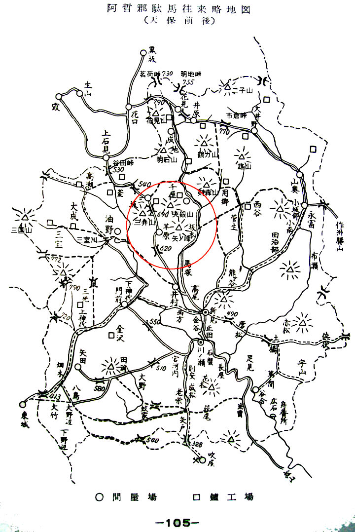 阿哲畜産史に見る芋原集落の繁栄(その2 江戸期 天保年間) −−−−−−−−−−−−−−−−−−−−−−−−−−−− 阿哲畜産史 第二編 江戸時代 2 駄馬の部 第七章 駄馬荷物と問屋 (一)鉄山荷物及び運送問屋 ![]() (p105)阿哲郡駄馬往来略地図 (天保前後) ゴシック体の山、峠、川の名前は書き足したもの。 −−−−−−−−−−−−−−−−−−−−−−−−− 新見藩は新見に、松山藩は川の瀬に荷物を集積させた。伯耆から、新見への三坂、芋原を経由する道筋は雲伯街道と呼ばれ、鉄の輸送路として重要であった。 問屋場は、民間業者が経営にあたり、藩も問屋株を与えるなどして保護した。芋原には、問屋場があったようだ。芋原集落の一軒は、江戸後期ばくろうを営んでいたとの話がある。これに対応するのであろう。(TKN) (09.4.15) |