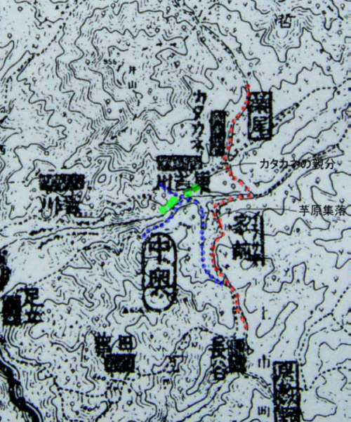 青点線 芋原集落の西を通る道 (地図に点線で道の記載あり、それをなぞっている。昭和27年発行だから、地図はそれ以前のもの)