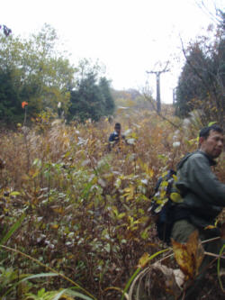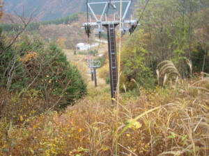 池ノ段の尾根南端から西へ、灌木やぶ15分でスキーリフト終点へ