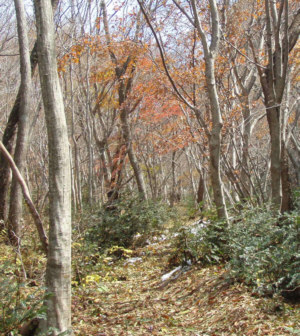 沢沿いの登りは、沢渡渉があり踏み抜き危険。トラバース気味の登山道は使えない。