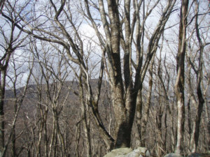 最初は植林帯を直登。尾根に出てからは、植林帯と自然林の境界を登った。