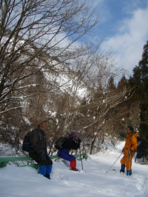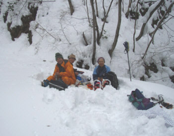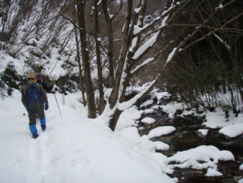 渓谷に沿う林道を車で除雪の終点まで行く。