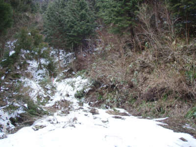 残雪あり。林道直進し終点から西向きに尾根を登る