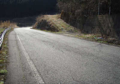 県道から林道への入り口。向こうから手前に坂は登っている。