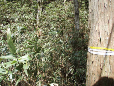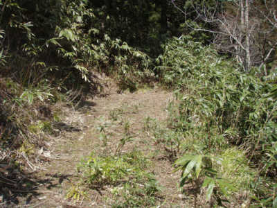 テープのところから植林帯、さらに根曲がり竹のヤブを北東へ1100mピークまで登る。