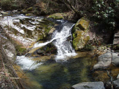 下りの林道から見た岩淵川。夏は、こんな川の中を歩いて下ろう