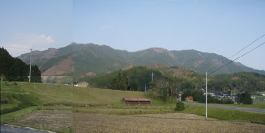 美作加茂からの大釈山(左山塊中央ピーク奥)と公郷山(右山塊の中央ピーク)