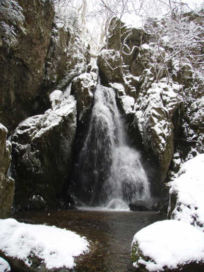 圧倒的な水量の不動の滝 右は3月訪れた時の滝の様子